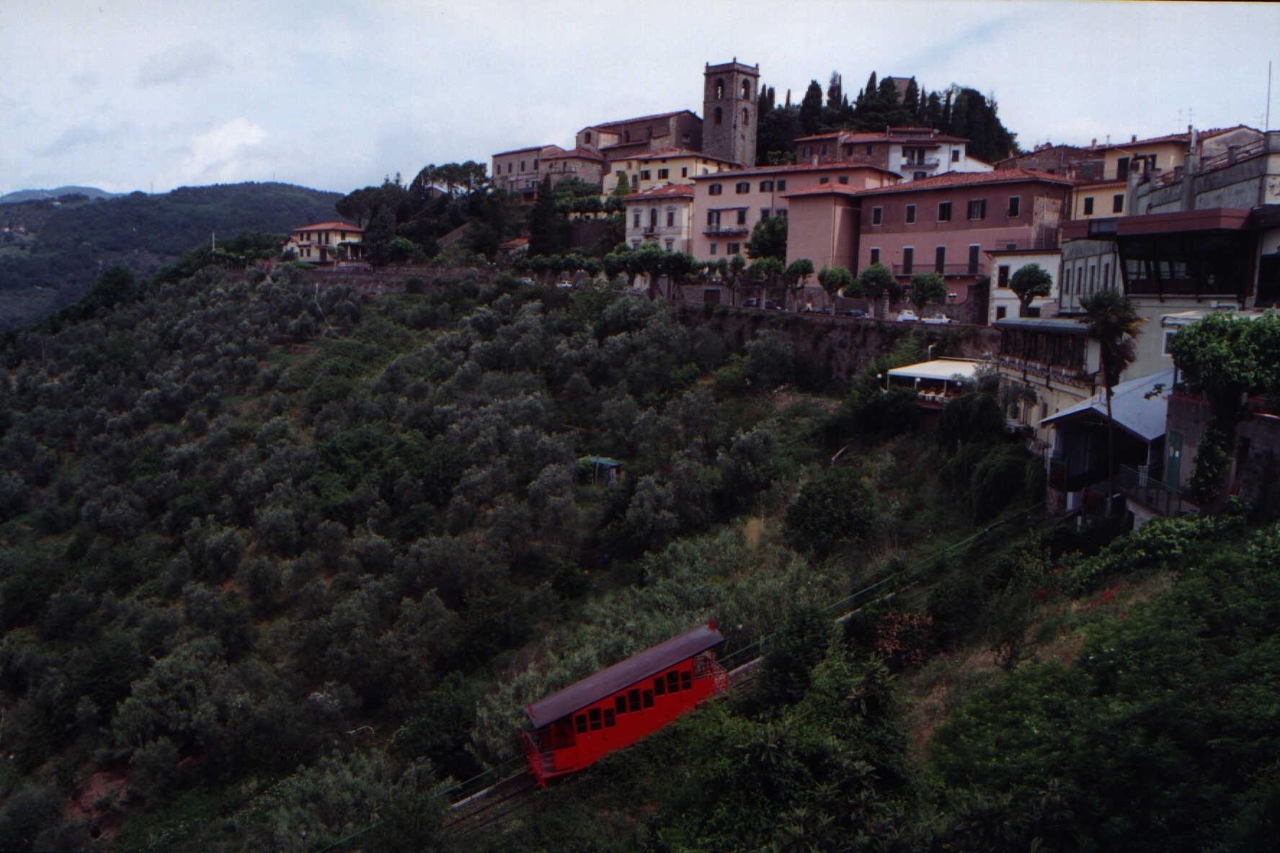 At the end of the XIX century, Mr. Alessandro Ferretti, an engineer from Genoa, had the idea to realize a ropeway between Montecatini Alto and Montecatini Terme, called respectively "the Castle" and "the Montecatini Baths". He obtained the relative licence by the Montecatini Municipality on October 8 1896 but he needed to find the necessary financing for this complex and expensive work. He found his capital partners in Genoa: Mr. Carlo Barbano and Mr. Giacomo Giovannetti (the square next to the Funicular is named after them) They took about 4 months to terminate the studies relative to the layout and to the location of the stations and to carry out the on-the-spot investigations on the lands where the Funicular would have run through and their consequent expropriation; in the end, on February 11, 1897, the majority partner, Mr. Carlo Barbano, sent to the Montecatini Terme Municipality "copy of the final layout and of the longitudinal profile of the Funicular according to the finally selected way and for which the definitive expropriation contracts were being entered into, according to the preliminary agreements taken with the land owners". On March 1, 1897 the first rail works began. The dream of many inhabitants of Montecatini to be easily connected to the "Castle" was about to come true. The excavation and building works such as viaducts and bridges and the track laying lasted some months. The beginning of 1898 was employed for the technical improvements of the facility and especially in preparing the great opening ceremony which took place on June 4, 1898 with the participation of famous people such as the genius of the opera, Giuseppe Verdi. Up to 1921 the two red little trains were operated by a big steam boiler located in the uphill station; subsequently, thanks to electricity, traction was carried out by a powerful electric motor. The Funicular service went on safely up to September 2, 1944 when a troop of sappers in retreat, in setting off some charges arranged in various sides of the facility caused serious damaged to it, making it unserviceable up to 1949. A Florentine entrepreneur, in collaboration with the Montecatini Municipality carried out the restoration works necessary for its reopening. The end of the war was followed by the years of the economic recovery. Montecatini became a very attractive thermal resort for thousands of people during summer and the Funicular was more and more utilized by the tourists who wish to visit the "Castle". In 1977 following some difficulties due to the facility upgrading and fitting works, the Funicular was closed and reopened only with the contribution of the Tuscany Region allowing the coaches restoration, the installation of a new motor and of a very modern "black box" for the trip control. The activity reopening took place on August 3, 1982. Since then in order to make the vehicle safer to passengers, various mechanical traction parts have been replaced and very important upgrading works have been realized. The two historical coaches, which "greet" half way, have not been modified. The structure is the same: three compartments with wooden benches and two external balconies, the most longed-for places from which you can enjoy a wonderful panorama. |